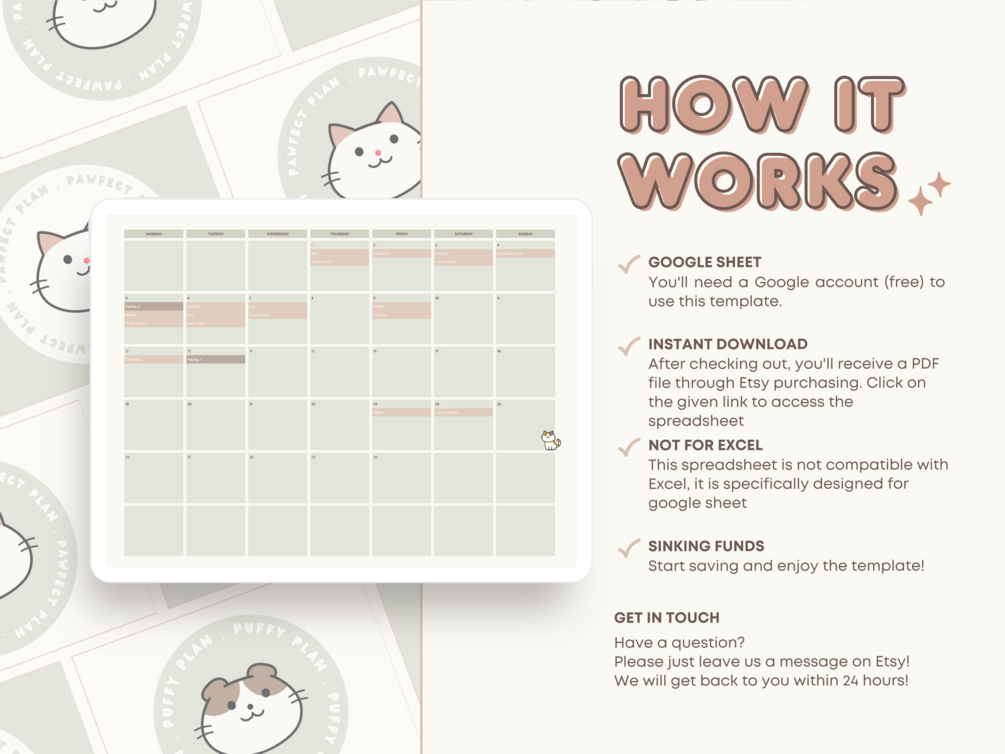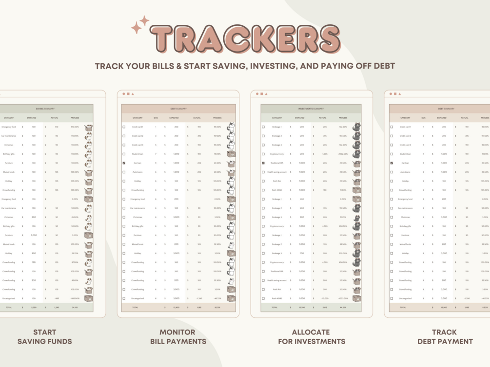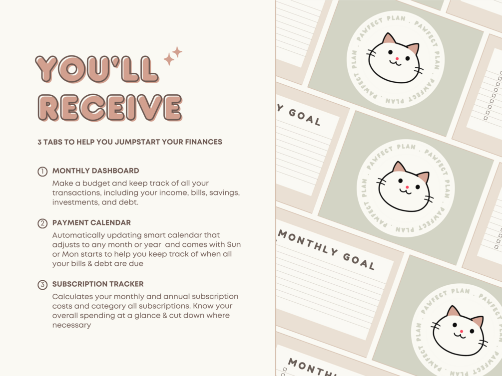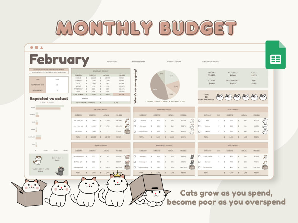 This Monthly Budget Spreadsheet uses a Raising Pets concept to inspire users and provides a visual representation of how your expenses, bills, savings, and debt payments look based on your budget. It is designed to be super cute, fun, and simple to use.