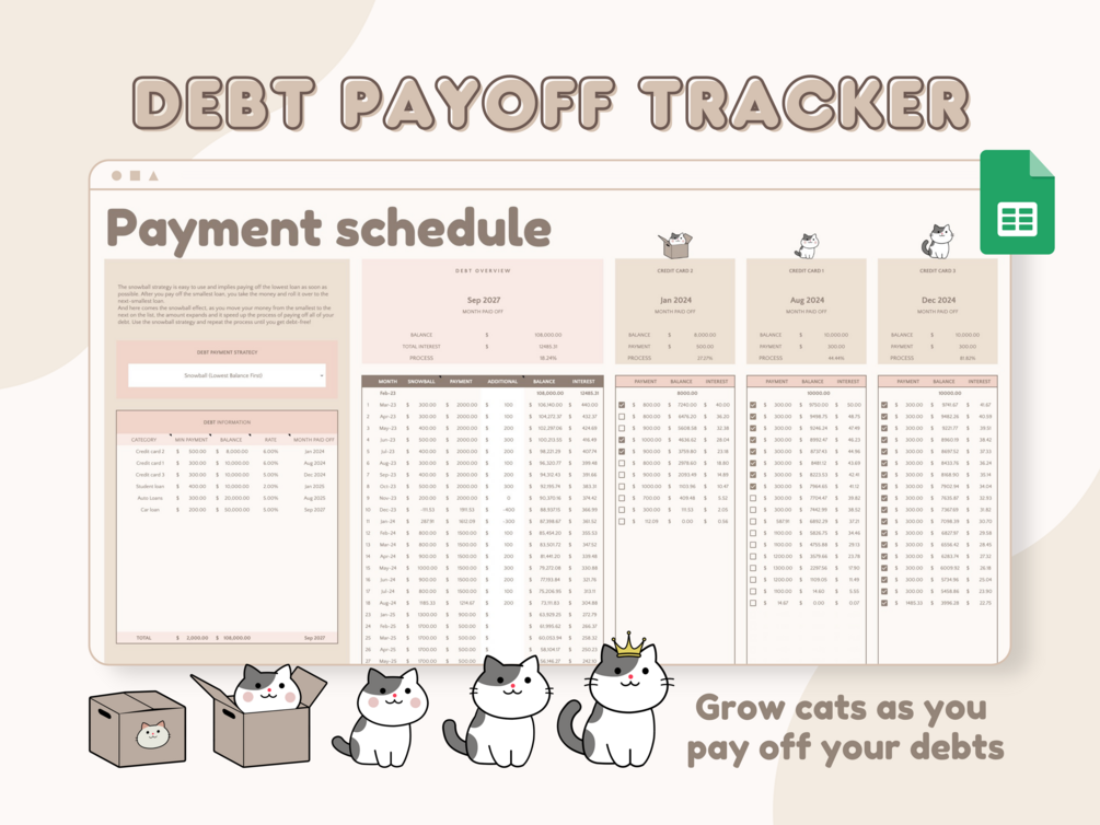 Using the straightforward Raising Cats concept, this Debt Snowball Tracker Spreadsheet for Google Sheets shows users how your Debts should look. Jumpstart your journey to becoming debt-free. See when you will complete repaying your debts and have all of the calculations done for you! Additionally, the spreadsheet is designed to be adaptable; you can easily add debt payments at any time and have your new monthly payments and payoff dates automatically updated!