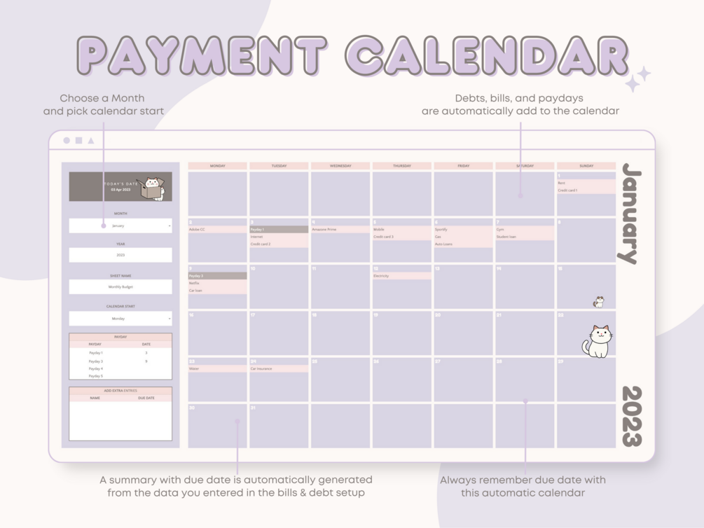 ✤ Payment calendar - View all of your upcoming monthly debts and bills.
