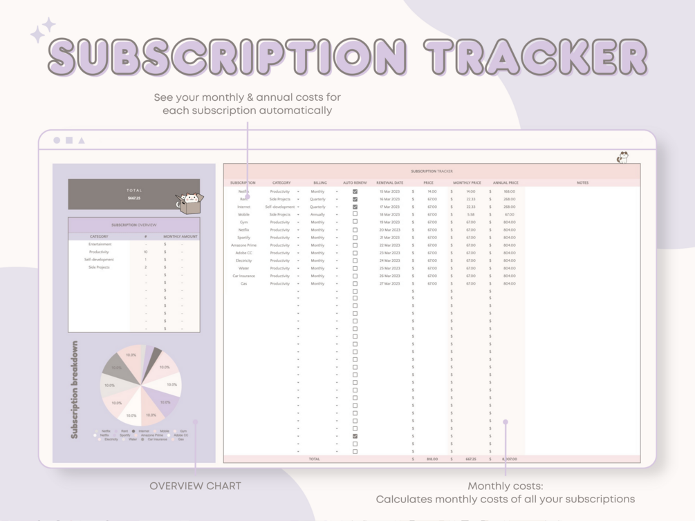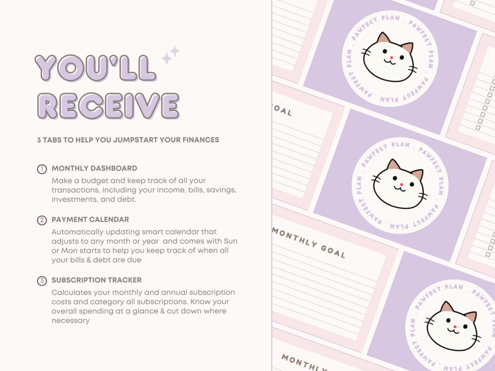 This Monthly Budget Spreadsheet uses a Raising Pets concept to inspire users and provides a visual representation of how your expenses, bills, savings, and debt payments look based on your budget. It is designed to be super cute, fun, and simple to use.