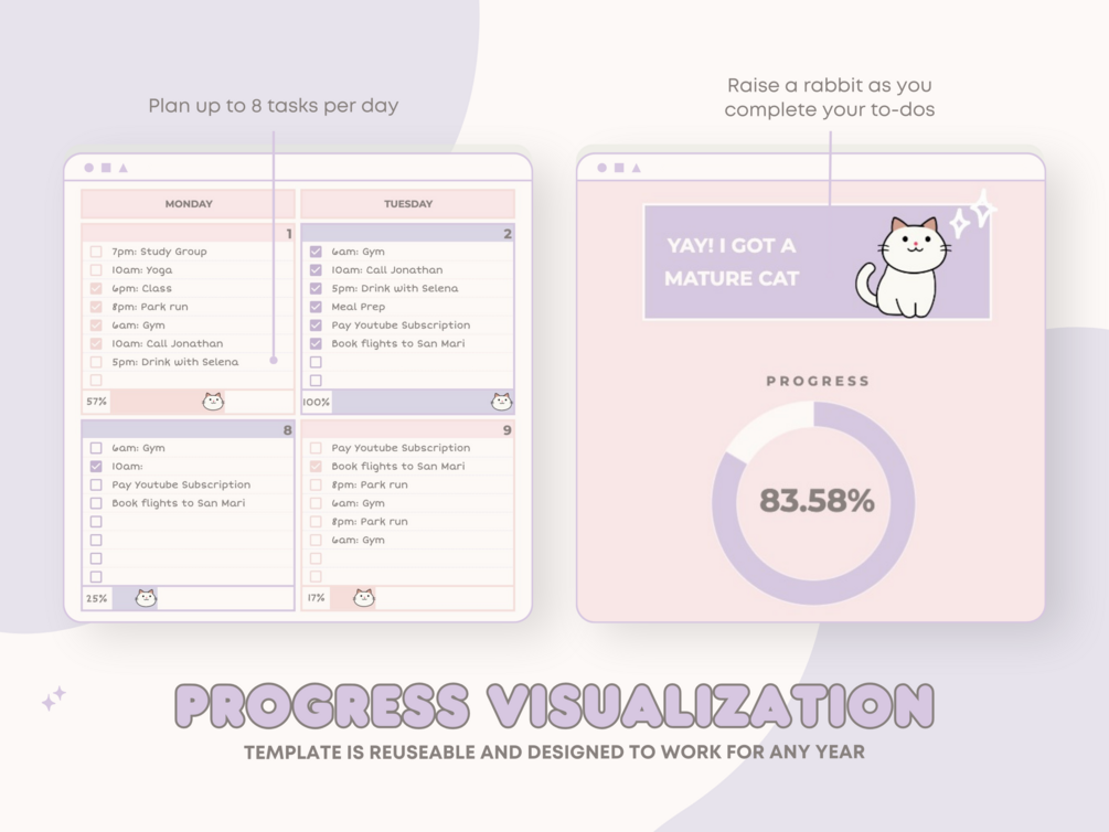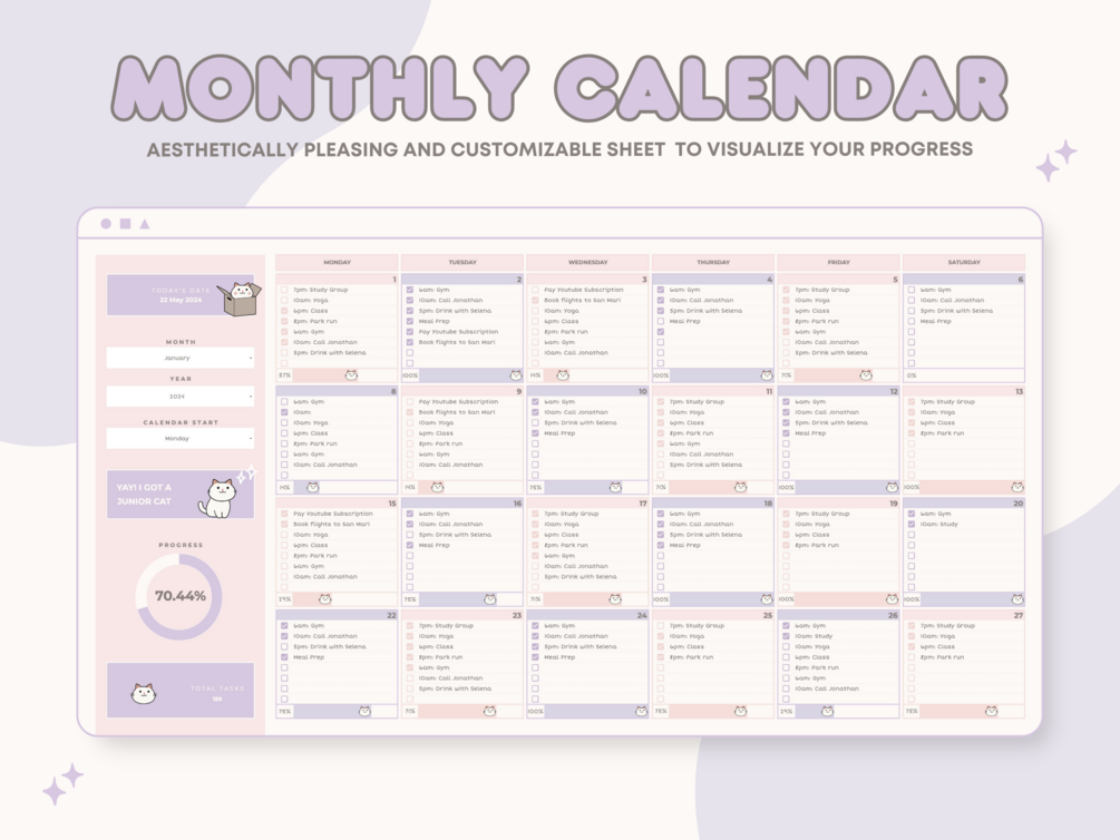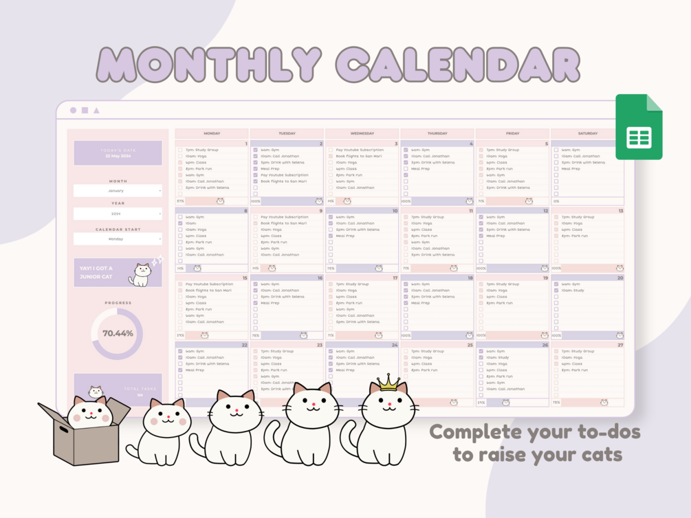 Designed to be beautiful, simple, and packed with useful stats, this Monthly Calendar for Google Sheets uses a simple Cat-raising concept to motivate you to get more done in a fun and unique way. This planner will help you get into a mindset where you're confident and empowered by creating healthy habits. Your mindset will be transformed and you’ll get clear on what you truly want in life. Also, watch as your little cat grows to mature as you achieve your goals.